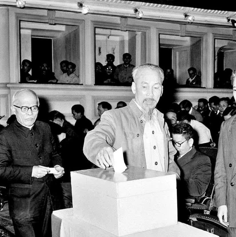 Chủ tịch Hồ Chí Minh bỏ lá phiếu đầu tiên bầu Ban Thường trực Quốc hội mới tại Kỳ họp thứ 6, Quốc hội khóa I. Ảnh: TTXVN