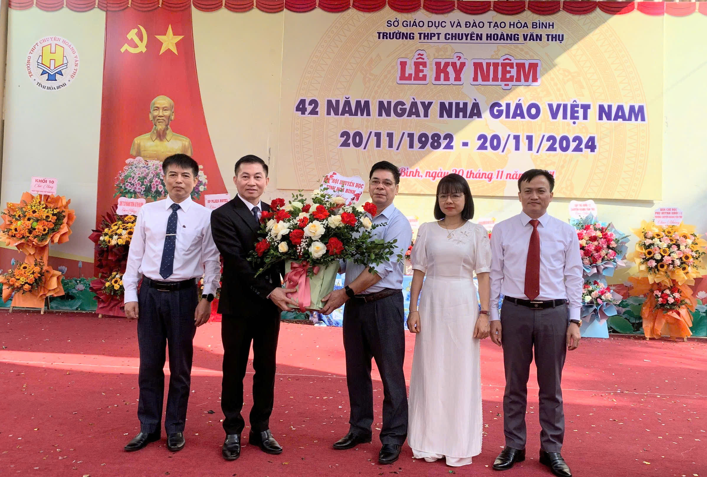 Ảnh: Lãnh đạo HKH tỉnh tặng hoa và chúc mừng trường THPT Hoàng Văn Thụ