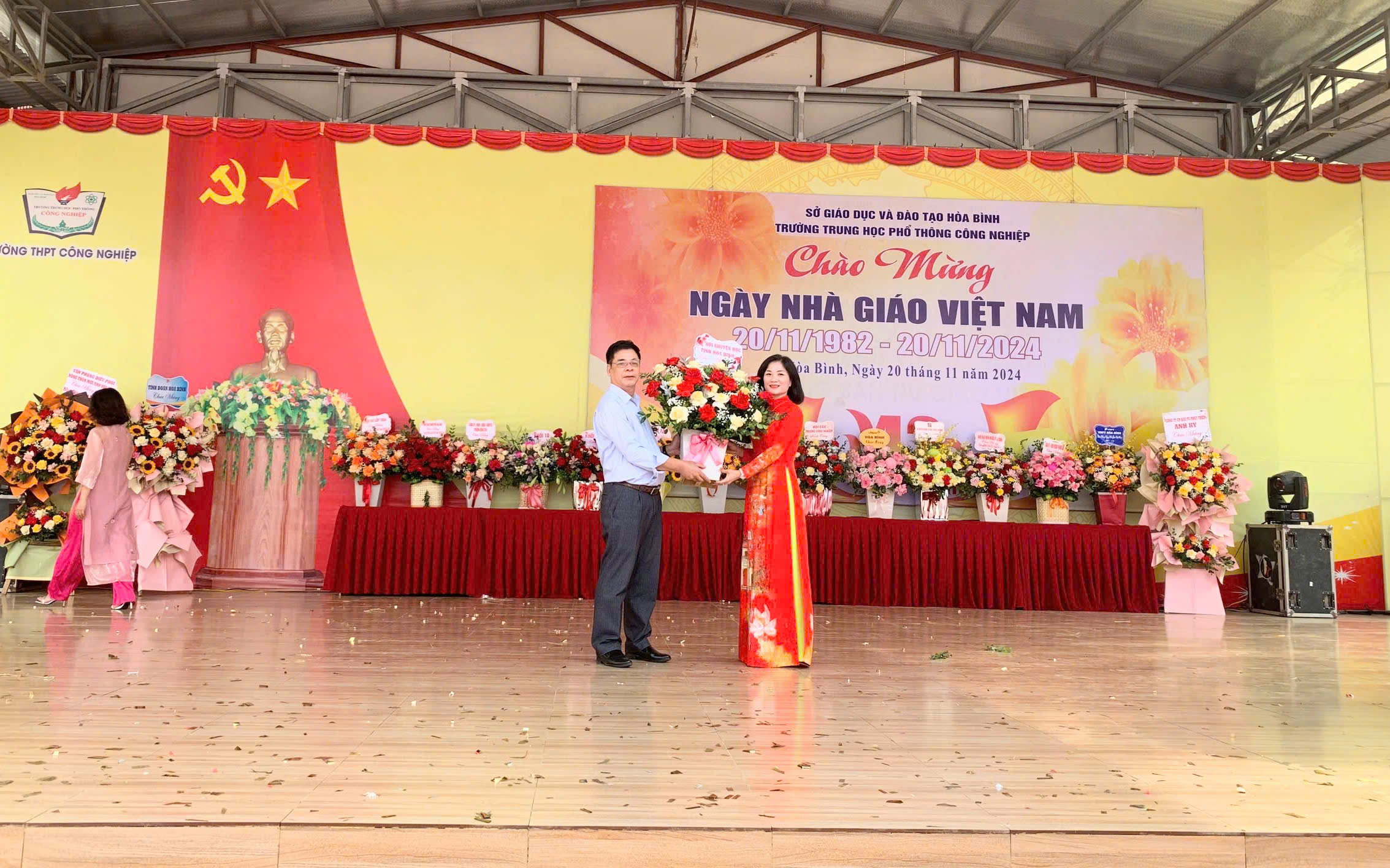 Ảnh: Lãnh đạo HKH tỉnh tặng hoa và chúc mừng trường THPT Công Nghiệp