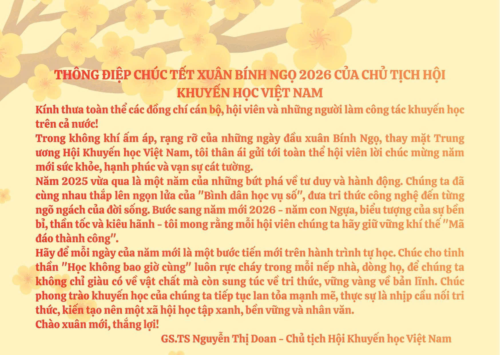Để ngọn lửa học tập suốt đời bùng cháy mạnh mẽ và xây dựng thành công một xã hội học tập toàn diện, 28 triệu hội viên của chúng ta chính là những "người nhóm lửa" và "giữ lửa" cần phải tiên phong đổi mới tư duy. Tôi mong muốn mỗi hội viên của Hội hãy tự hào về vị thế cao quý của mình: chúng ta không chỉ là những người đi thúc đẩy phong trào, mà cũng là người kiến tạo nền tảng của xã hội học tập cho sự phát triển bền vững.